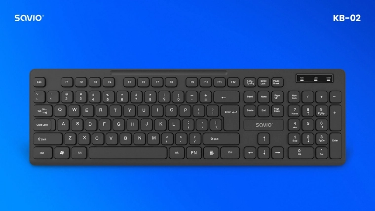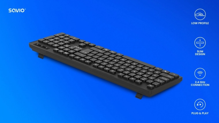 Nyd friheden uden kabler og et ryddeligt arbejdsområde. Det trådløse tastatur Savio KB-02 med 2,4 GHz-frekvens leverer en stabil forbindelse uden forsinkelse og rækkevidde til komfortabel betjening. Den lave tasteprofil og den slanke krop giver behagelig skrivning selv ved længere tids brug.