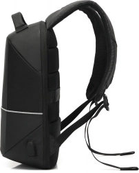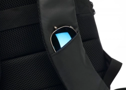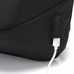 Den sidemonterede USB-port gør det nemt at oplade enheder undervejs ved hjælp af en powerbank placeret inde i rygsækken.