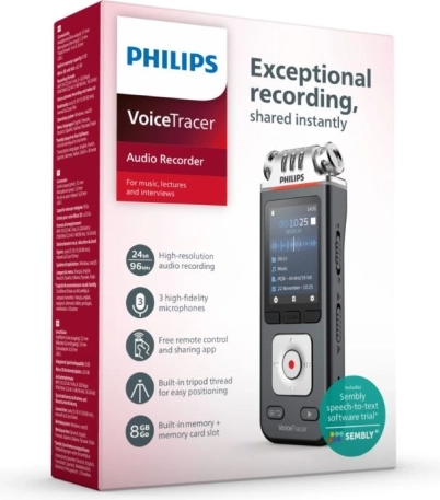 PHILIPS VoiceTracer DVT6115 er en smart diktafon designet til klar og naturlig optagelse i enhver situation. Tre højtro mikrofoner med høj signal‑til‑støj‑afstand, kvalitetsophæng og tydelig kanaladskillelse fanger detaljeret stereolyd, der føles som live. Optag i det universelle MP3 eller ukomprimeret PCM (WAV) i kvalitet tæt på CD, og styr optagelsen bekvemt på afstand via Philips VoiceTracer-appen.