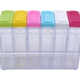 Elegant sæt med 6 gennemsigtige beholdere til krydderier med dedikeret stativ. Et nødvendigt hjælpemiddel til dit køkken, der gør det nemt at identificere krydderier takket være farveløst plastik.