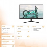 Skærmen har et elegant, sort design og understøttes af et minimalistisk stativ, der fremhæver stabilitet og stil.