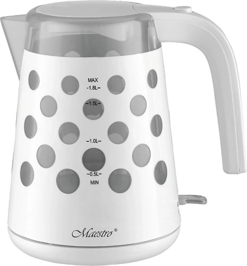 Maestro KROPKI hvid elkedel er ideel til ethvert køkken. Med kapacitet på 1,7 liter og effekt på 2200 W sikrer den hurtig opvarmning af vand. Skjult varmeelement forbedrer ikke kun æstetikken, men letter også rengøringen, mens blå LED-belysning tilføjer et moderne look.