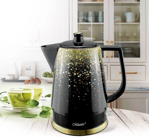 Elegant keramisk elkedel Maestro med en kapacitet på 1,5 l og effekt på 1500 W bringer hurtigt vandet i kog og gør hverdagsbrug mere behageligt. Den tilbyder en 360° drejbar base og kabelopbevaring, belyst afbryder samt automatisk slukning ved kogepunktet. Et skjult varmelegeme gør rengøringen lettere, skridsikre fødder sikrer stabilitet, og en indvendig max-niveaumarkering hjælper med præcis påfyldning.