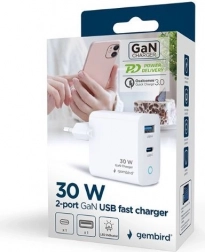 Denne moderne 30 W GaN‑oplader kombinerer høj ydelse, kompakte mål og universel anvendelse. Med USB‑C og USB‑A oplader du nemt smartphone, høretelefoner, tablet og kompatibel bærbar. Understøttelse af Power Delivery og Quick Charge 3.0 sikrer hurtig og sikker opladning uden unødig ventetid.