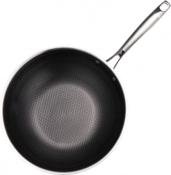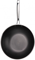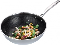 Robust MAESTRO-wok med en diameter på 30 cm og et tredobbelt lag af rustfrit stål og aluminiumskerne, som sikrer hurtig og jævn varmefordeling, ridsemodstand og non-stick overflade med honningkagestruktur. Velegnet til alle typer komfurer inklusive induktion, med et komfortabelt rustfrit stålhåndtag, der ikke overophedes, og mulighed for opvask i opvaskemaskine.