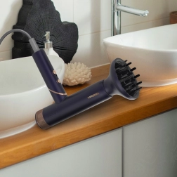 Koncentratoren styrer luftstrømmen præcist til en glat føn og pandehår. Diffuseren fordeler luften jævnt, fremhæver naturlige bølger og giver volumen uden krus.