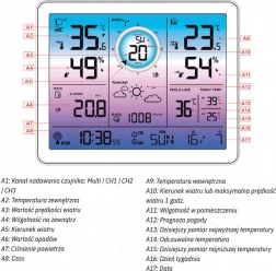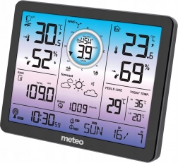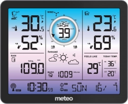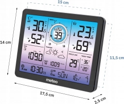 Denne meteorologiske station måler indvendig og udvendig temperatur i området fra -30 grader C til +50 grader C. Den har også trådløs fugtmåling, hvilket hjælper med en bedre forståelse af miljøet omkring dig. Barometer giver dig information om det atmosfæriske tryk i området 800 til 1100 hPa.