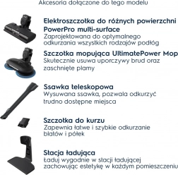 Støvsugeren indeholder: elektrisk børste til tæpper og hårde gulve med LED-belysning PowerPro Multifloor, moppebørste PowerPro Mop, teleskopisk fugemundstykke, støvbørste, ladestation. Nem adgang til håndenheden og det medfølgende tilbehør gør det muligt at støvsuge grundigt og hurtigt på forskellige overflader – fra gulv til svært tilgængelige kroge.