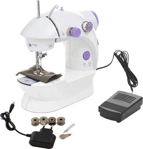 Denne let transportable mini-symaskine er fremstillet af holdbar plast og er ideel for dem, der lige er begyndt at sy, eller som et supplement til en standard symaskine. Maskinen kan betjenes med pedal eller med en specialknap på kabinettet.
