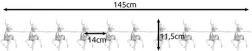 Takket være batteridriften er der ikke behov for adgang til en stikkontakt, hvilket giver nem mobilitet. Rensdyrene på kæden er lavet af gennemsigtig plast, hvilket giver en effektiv lysspredning. Hvert rensdyr er 11,5 cm højt, og afstanden mellem dem er 14 cm, hvilket sikrer en harmonisk lysspredning. Perfekt til at dekorere træet, vinduer, kamin eller hylder – overalt skaber den en magisk atmosfære.