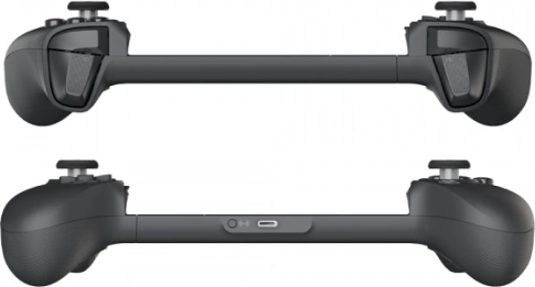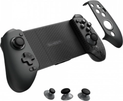 Det udtrækkelige design passer til en bred vifte af telefoner, og den ekstra plads bagtil gør, at den også kan bruges med cover. Controlleren understøtter gyroskopisk styring i SWITCH‑tilstand, har makroknapper på bagsiden, Turbo og fuldt ommappelige knapper. Magnetisk frontcover, stick‑caps og frontknapper gør det hurtigt at tilpasse både look og ergonomi.