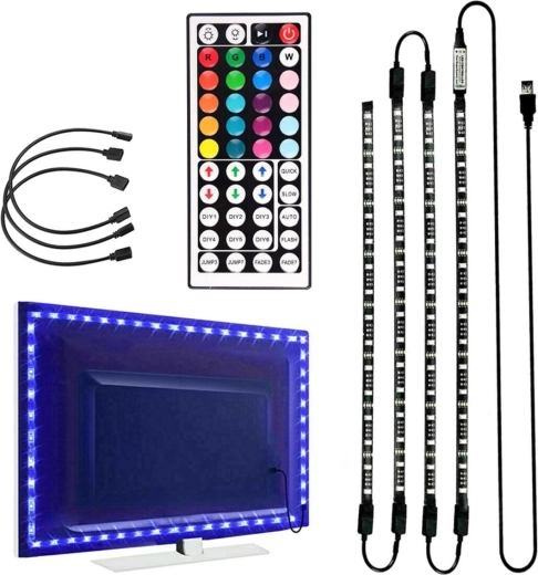 - Sæt med fire RGB LED-strips til belysning af væggen bag tv’et.