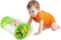 Cylinderen er udsmykket med farverige dyreillustrationer og indeholder tre bolde, der rasler let ved bevægelse, hvilket underholder og stimulerer børnene.
