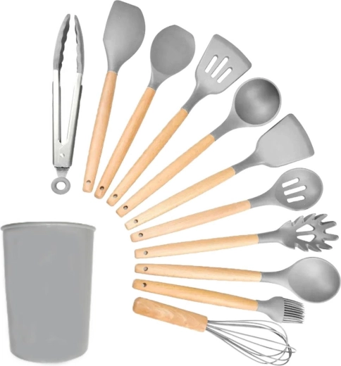 Materiale: træ + TPE-silikone til redskaber og PP-plast til beholder. Tåler høje temperaturer og er designet til lang levetid.