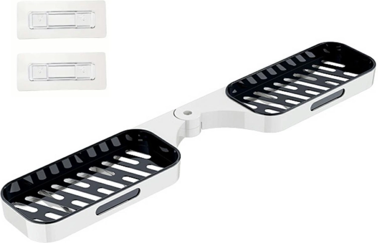 Praktisk, væghængt hylde. En usædvanligt bekvem og pladsbesparende løsning. Ekstremt nem og ikke-invasiv montering med to selvklæbende kroge. Den store fordybning i hver kop forhindrer, at kosmetik utilsigtet falder ud. Den smarte konstruktion forhindrer vandophobning (perforeret bund). Fungerer fremragende som brusehylde til kosmetik eller som sæbeskål.En yderligere fordel er muligheden for at dreje hylderne og montere dem i en vinkel på 90 grader.