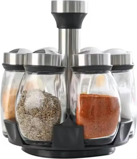 - Sæt med 6 gennemsigtige krydderibeholdere med en speciel roterende base.