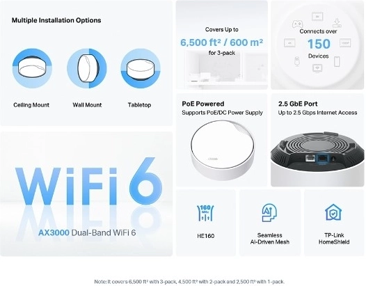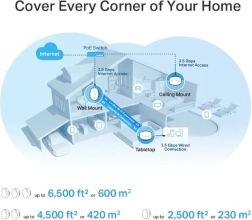 Takket være Power over Ethernet-teknologi kan enheder nemt placeres på vægge eller lofter uden behov for en separat strømkabel, hvilket er ideelt til moderne hjem. Med TP-Link Deco-appen er konfiguration og netværksstyring intuitiv og sikker, med muligheden for forældrekontrol og avanceret sikkerhed.