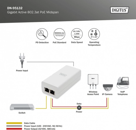 Forsyn mere krævende PD-enheder – access points, IP-kameraer eller VoIP – takket være udgang 52 V DC / 0,58 A (op til 30 W) iht. IEEE 802.3at, bagudkompatibel med 802.3af.