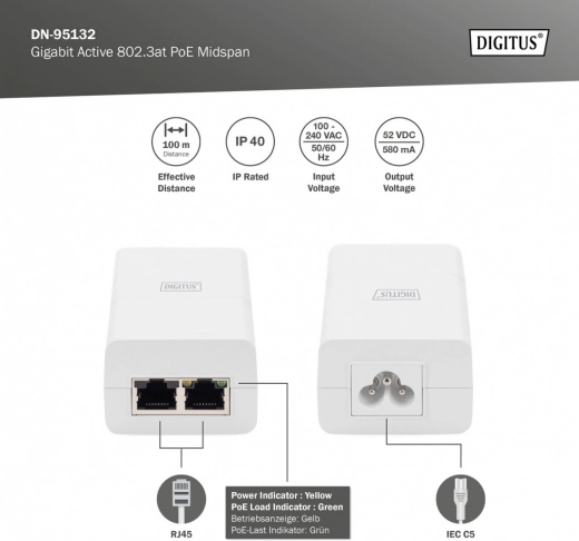 Aktiv midspan PoE-injektor til indendørs brug kombinerer data og strøm i ét ethernetkabel og forenkler markant installationen af netværksenheder. Understøtter IEEE 802.3at (PoE+) med bagudkompatibilitet til IEEE 802.3af, leverer udgang 52 V DC / 0,58 A (op til 30 W) og arbejder ved hastigheder 10/100/1000 Mb/s. To RJ45-porte (LAN og PoE) muliggør problemfri strømforsyning og dataoverførsel på afstande op til 100 meter via Cat5e/Cat6-kabel.