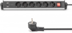 Der medfølger to robuste klemmer til hurtig montering på bordplader med en tykkelse på 20–57 mm uden boring. Efter fastgørelse kan skinnen roteres horisontalt 180° for optimal adgang til stik og USB-porte. For sikker drift findes en bagbelyst hovedafbryder og børnesikringer i de jordede stik.