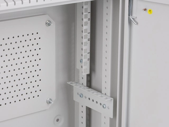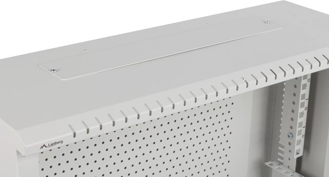 Skabet leveres fuldt samlet i én pakke. Døre der kan åbnes til begge sider gør service og adgang nemmere. Integrerede ventilationsåbninger i top-, bund- og sidepaneler sikrer luftgennemstrømning og stabil temperatur indvendigt. Aftagelige kabelgennemføringer muliggør montering af LANBERG børstepaneler og holder orden i kabelføringen.