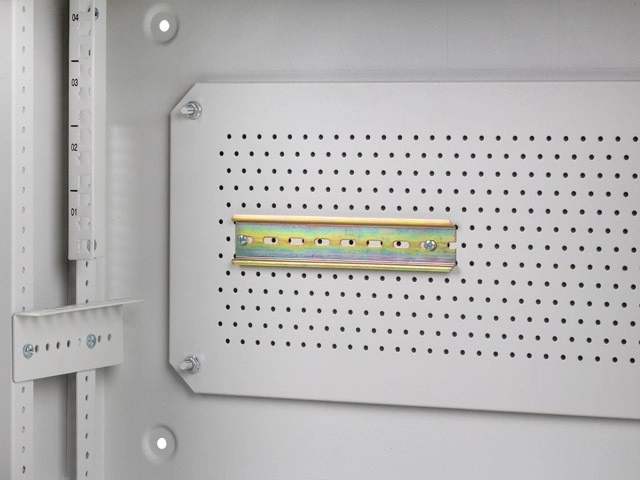 På bagsiden er der en perforeret (mesh) monteringsplade til M4-skruer samt en medfølgende DIN-skinne for nem fastgørelse af tilbehør. Der medfølger jordledning, ankre og M6-skruer for solid og sikker montering. Otte udbrydelsesgennemføringer i bagpanelet giver fleksibilitet til både strøm- og datakabler.