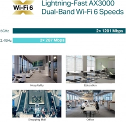 - Hurtige Wi‑Fi 6‑hastigheder: Samtidig understøttelse af op til 574 Mb/s på 2,4 GHz-båndet og 2402 Mb/s på 5 GHz-båndet, i alt op til 2976 Mb/s.