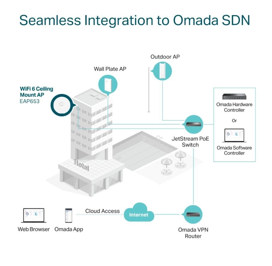 - Centraliseret cloudadministration: Integration med Omada SDN-platformen muliggør lokal og fjern styring via webgrænseflade eller Omada-appen.