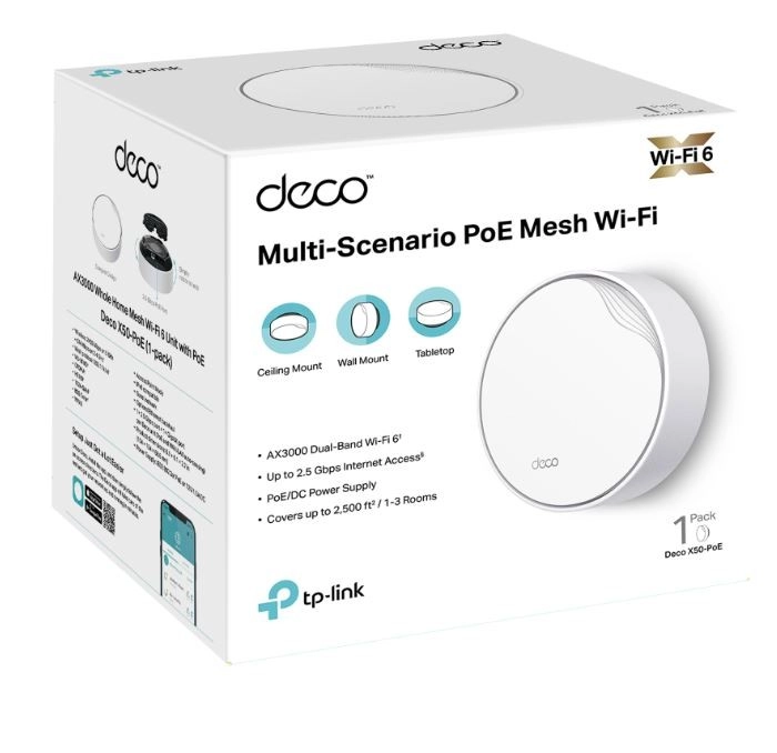 Systemet understøtter strøm via Ethernet (PoE), hvilket i høj grad forenkler installationen og giver fleksibel placering af enhederne. Deco X50-PoE er udstyret med én 2,5 Gbps-port og én gigabit-port, som begge understøtter PoE og sikrer højhastigheds kablet forbindelse. Takket være det kompakte design kan den nemt integreres på bord, væg eller loft.