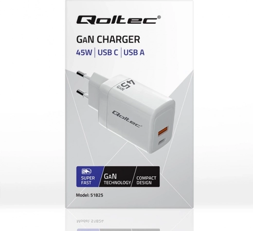 Hurtig og effektiv Qoltec 45W GaN oplader med USB-C PD og Quick Charge 3.0.