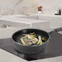 Takket være dybden på 7,5 cm tilbereder du nemt gullasch, sauté, pasta og sauterede grøntsager. De dobbelte udgydningsnæser giver præcis ophældning af saucer og fond uden spild. Panden er egnet til alle typer komfurer, inklusive induktion, og det ergonomiske håndtag sikrer komfortabel og sikker håndtering.