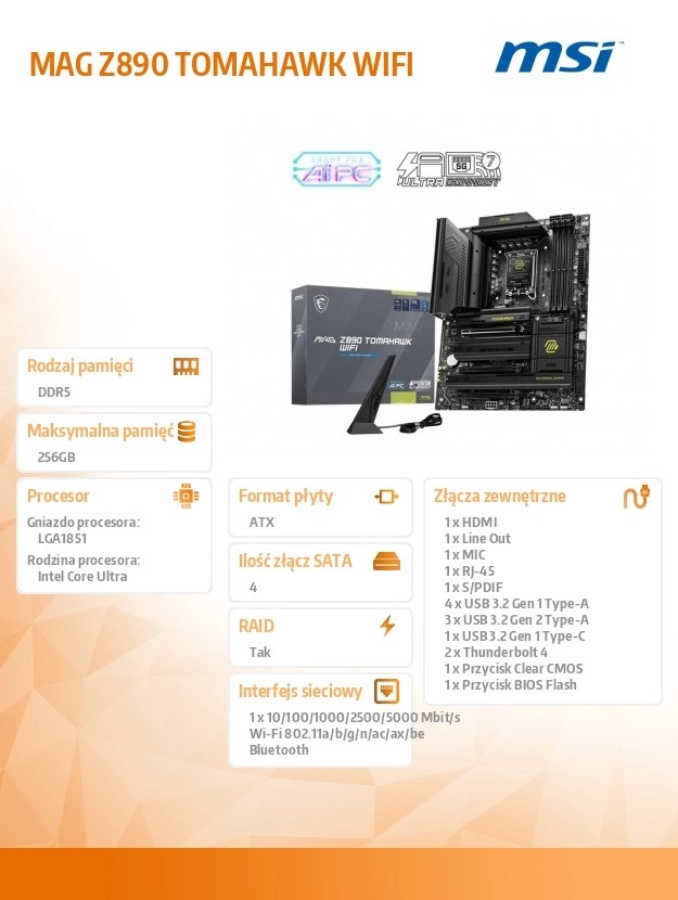 Kraftigt spille bundkort MSI MAG Z890 Tomahawk WiFi er designet til gamere, der kræver stabilitet, holdbarhed og nem installation. Med understøttelse af Wi-Fi 7, 5G LAN, Thunderbolt 4 og PCIe 5.0 er det ideelt til de nyeste Intel Core Ultra processorer.