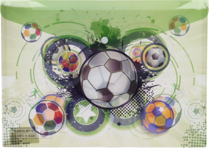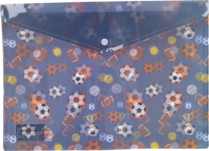 Praktisk plastmappe med trykknap i størrelsen 35,8 × 26 cm, der beskytter dine A4-dokumenter sikkert. Ideel til skole og kontor, med attraktive sportsmotiver med bold og en behagelig trykknaplukning. Tilbyder hurtig adgang, beskyttelse mod krøl og fugt samt 4 forskellige designs til enhver sportsfan.