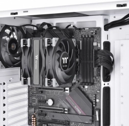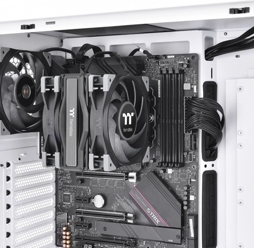 Thermaltake ToughAir 510 er en pålidelig tårnkøler til CPU, designet til stabile temperaturer og lavt støjniveau. Kombinationen af to 120 mm blæsere i push-pull og fire 6 mm kobber-heatpipes med direkte kontakt leder effektivt varmen væk fra processoren og sikrer optimal ydeevne selv under krævende belastning.