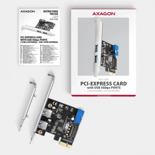 PCIe-kortet tilføjer op til 4 USB 5 Gbps-porte (USB 3.2 Gen 1) til din pc. To føres ud som USB-A på bagpladen, og yderligere to leveres via en intern 19-pin USB-header til tilslutning af kabinettes front-USB eller interne enheder. Controlleren bygger på Renesas-chipset med UASP for hurtigere arbejde med eksterne SSD’er og solid kompatibilitet.