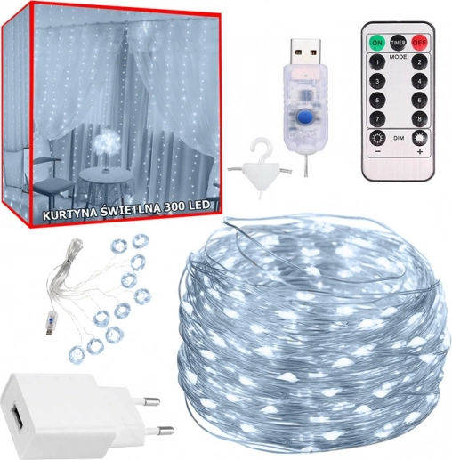 Denne lysgardin skaber en magisk atmosfære i stuen, soveværelset og til bryllupper. Med 300 energieffektive LED-dioder og et blidt koldt hvidt lys får du hyggelig ambient belysning uden blænding. Fjernbetjeningen tilbyder forskellige lysprogrammer og lysstyrkeindstillinger til enhver lejlighed.