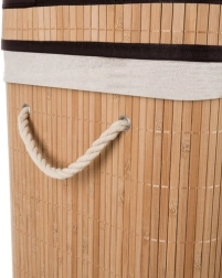 Vertikale bambustrimmer kombineret med stofindsats og låg, der ikke kun er æstetisk tiltalende, men også giver styrke og holdbarhed. Praktiske rebhåndtag gør det nemt at transportere kurven selv når den er fyldt.
