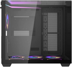 Darkflash-kabinettet er et moderne valg for enhver, der søger kvalitet og stil. Dette computerkabinets gennemsigtige glas-sidepanel giver dig udsyn til det velorganiserede indre. Med RGB-belysning og flere ventilationsmuligheder er det designet til et flot æstetisk udtryk og effektiv køling.
