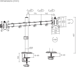 Denne universelle skrivebordsholder er designet til montering af to LCD-, LED- eller monitorskærme fra forskellige mærker med en skærmstørrelse fra 17" til 32". Større skærme kan monteres, hvis de ikke overskrider den maksimale vægt og opfylder VESA-standarden. Holderen bidrager til større arbejdskomfort takket være mulighederne for justering af hældning, rotation og højde, hvilket optimerer ergonomi og synlighed.
