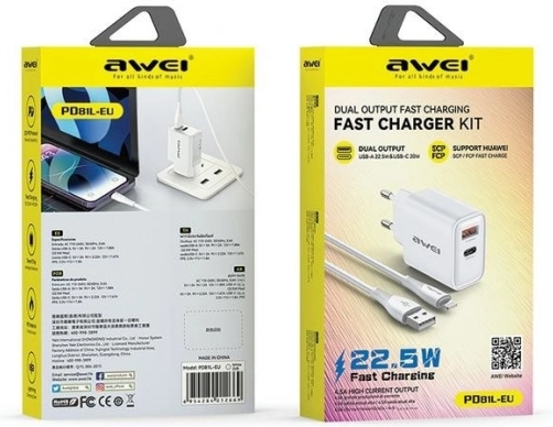 Kompakt AWEI‑sæt: GaN‑oplader 22,5 W med USB‑A/USB‑C og 1 m USB‑A/Lightning‑kabel. Hurtig og sikker opladning med understøttelse af QC3.0, FCP, AFC, SCP.