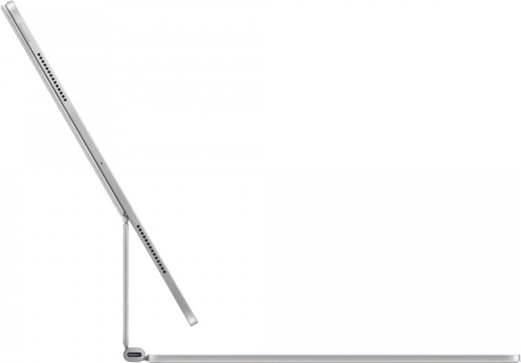 Det aluminiumsforstærkede hængsel løfter iPad over tastaturet, giver jævn justering af vinklen og tilføjer en praktisk USB‑C‑port til strømforsyning.
