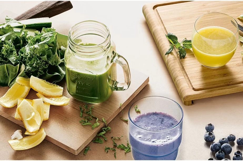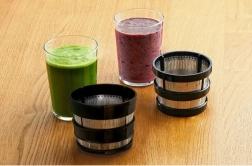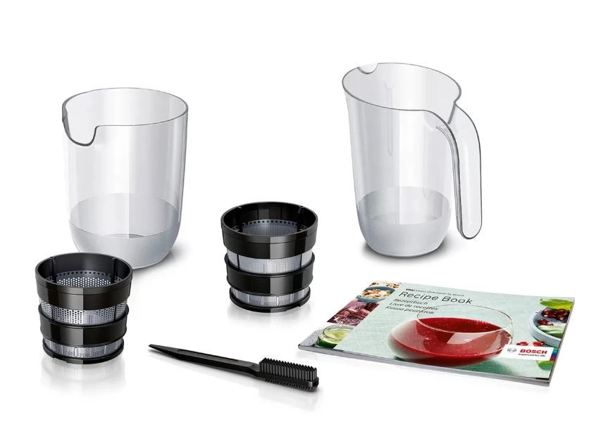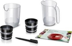 Alle plastdele, der er i kontakt med fødevarer, er BPA-fri og kan nemt vaskes i opvaskemaskinen. Den robuste, meget støjsvage 150 W motor med cirka 55 omdr./min. sikrer højt saftudbytte med minimal støj. Der medfølger også en opskriftsbog fuld af idéer til juicer, smoothies og sunde drikke.