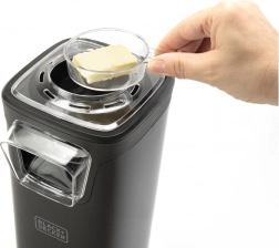 Der medfølger en multifunktionel måleske, som hjælper dig med at dosere den rette mængde og samtidig kan bruges til at smelte smør eller tilberede topping, mens maskinen kører. Takket være det kompakte og let rengørlige design passer maskinen perfekt i ethvert køkken.