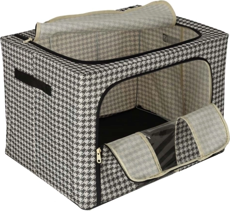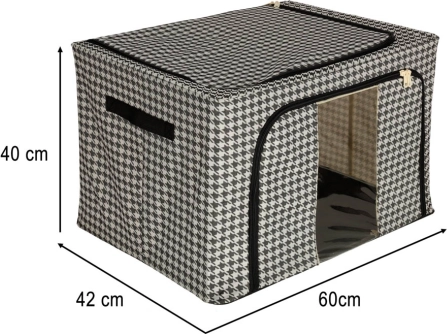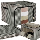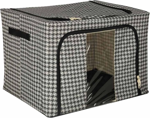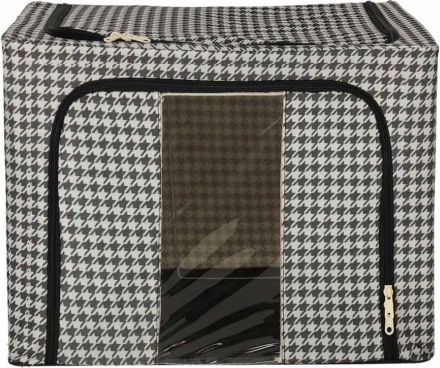 Stilren sort‑hvid opbevaringsboks med pepitomønster og et volumen på 100 l, som hjælper dig med at holde orden i garderoben. Den har et solidt indvendigt stel, et gennemsigtigt vindue for hurtigt overblik over indholdet og lynlåslukning, der beskytter tekstiler mod støv og snavs.