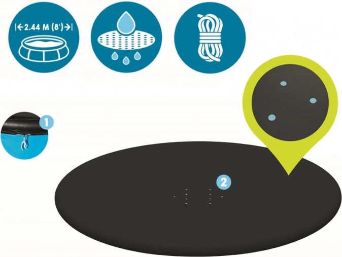 Vælg en smart løsning for renere vand og mindre vedligeholdelse. Overtrækket er velegnet til runde fritstående bassiner med oppustelig kant med en diameter på 244 cm (Fast Set-serien). Den kompakte pakning er let at opbevare og egner sig også som gave.