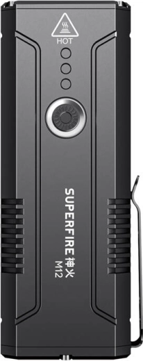 Superfire M12 er udstyret med seks lysindstillinger til forskellige situationer. Den tilbyder svag, mellem og stærk belysning samt Strobe- og SOS-tilstande, som er uundværlige i nødsituationer. Med turbofunktionen, som aktiveres med et dobbeltklik, kan du opnå den fulde effekt på 8.000 lumen.