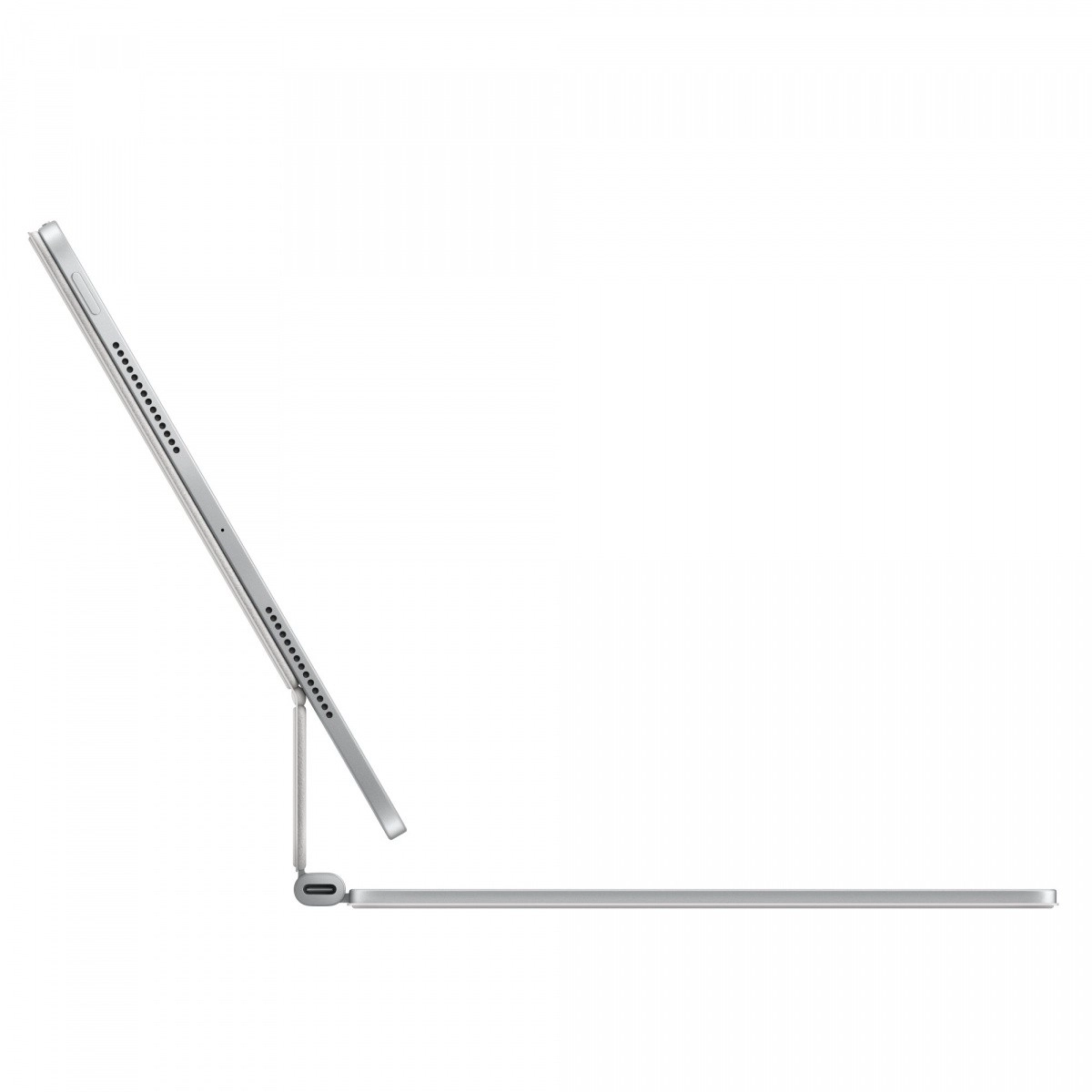 Det fuldstørrelses tastatur med bagbelysning og præcis saksemekanisme (1 mm vandring) er stille og komfortabelt selv ved lange skrivepasser. En række på 14 funktions taster øger hastigheden – fra lysstyrke og lydstyrke til andre nyttige genveje. Den integrerede USB‑C i hængslet bruges til opladning, så iPad‑porten forbliver fri.