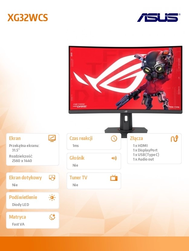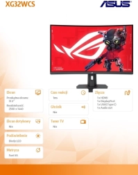 ASUS ROG XG32WCS leverer en stor 32‑tommer skærm for en fuldendt oplevelse til spil, arbejde og film. Takket være 180 Hz opdateringshastighed og hurtig responstid får du usædvanligt flydende billeder med minimal sløring. Den brede tilslutning, inklusive USB‑C, gør det let at koble bærbar og tilbehør til med ét kabel.