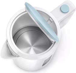 Den praktiske gennemsigtige indikator på siden af kedlen gør det muligt at måle vandmængden præcist, hvilket hjælper med at spare energi og vand. Det store låg, som åbnes nemt med en knap, gør påfyldning og rengøring enklere.