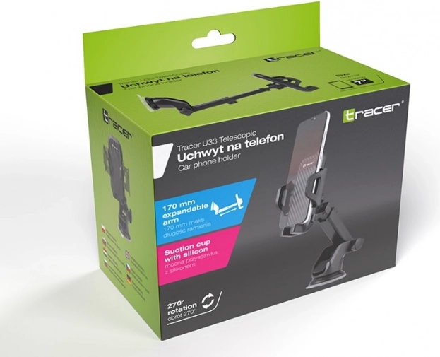 TRACER U33 Telescopic telefonholder til bil er designet til sikker og bekvem brug af din smartphone under kørsel. Den robuste silikonesugekop fastgøres til forruden eller instrumentbrættet og sikrer maksimal stabilitet selv på ujævne veje. Med kompatibilitet til smartphones op til 7" dækker den de fleste almindelige modeller.